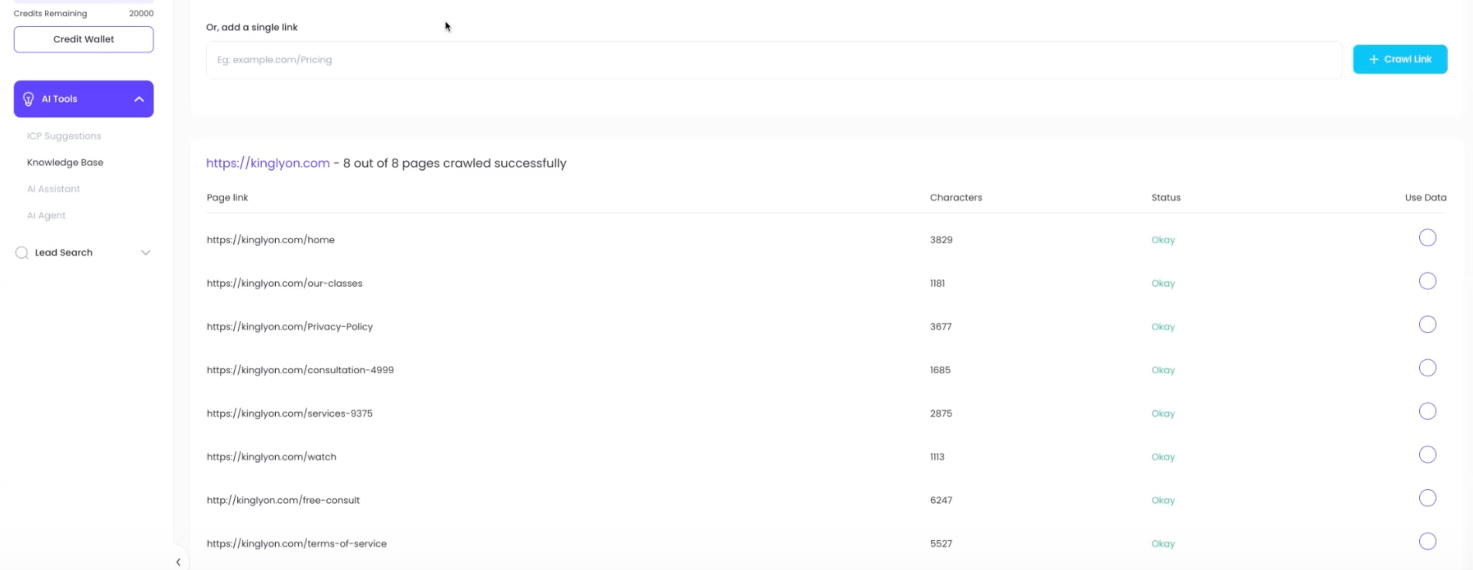 - After the crawl completes, the Knowledge Base will list crawled pages.